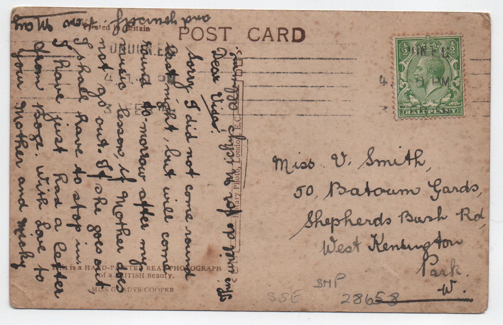 Gladys Cooper Hand Painted Real Photographic Postcard.Creasing to top left, general edge rubbing. Published by, Rotary Photographic. Posted around 1918 or earlier.