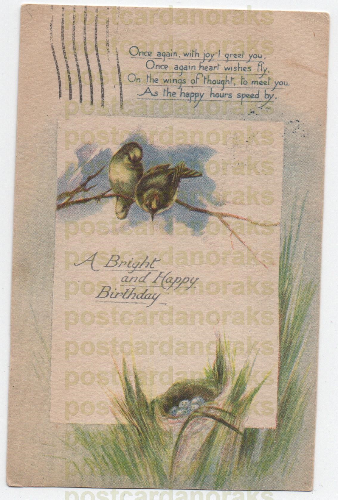 Birthday Tucks 1918 Vintage Postcard. A bright and happy birthday, from top publishers, Raphael Tuck.st franking shows through to front top. Sent to an addressee in, Hartlepool.