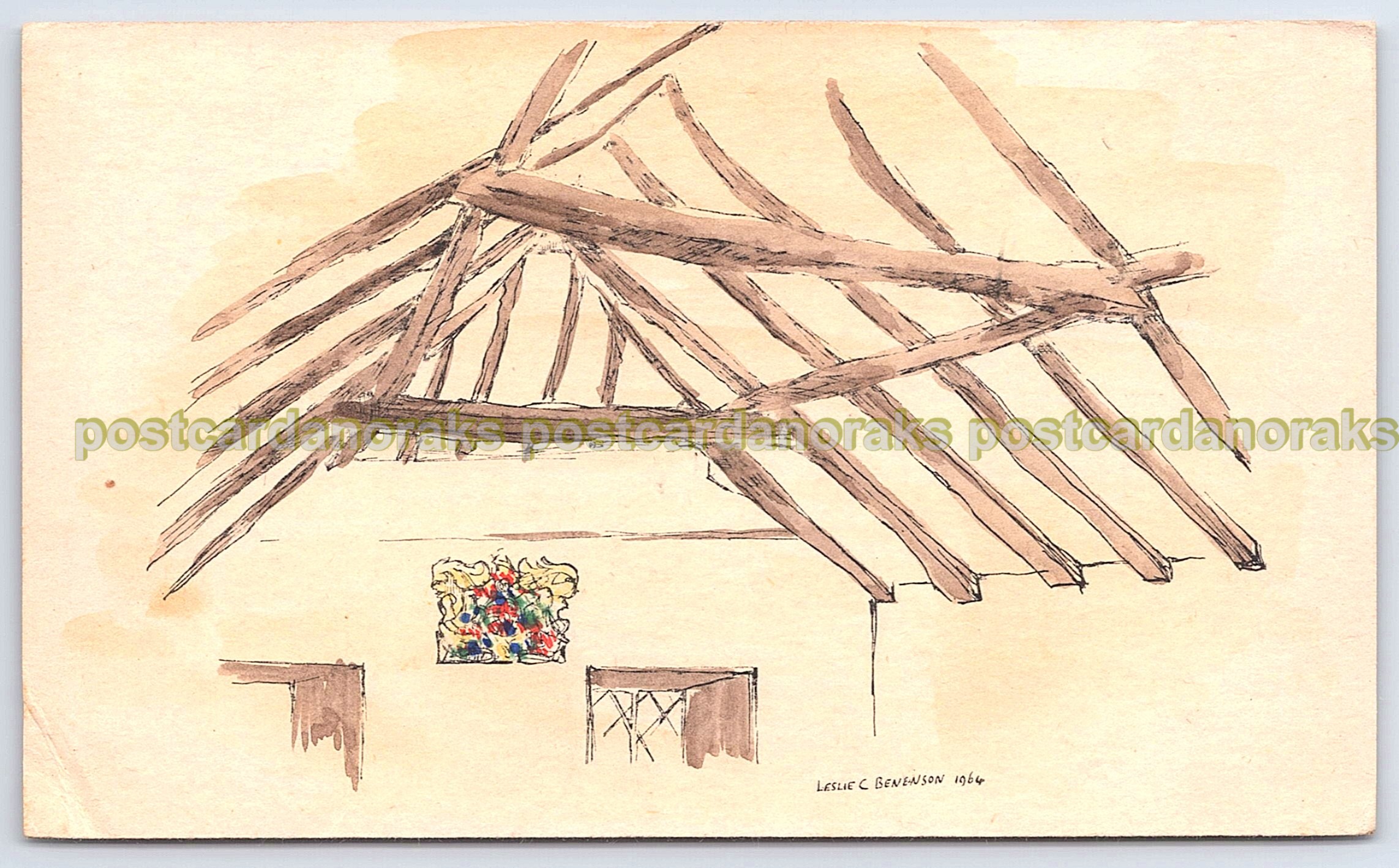 Interior beams, original postcard from artist Leslie Charlotte Benenson in 1964. Minor edge handling.