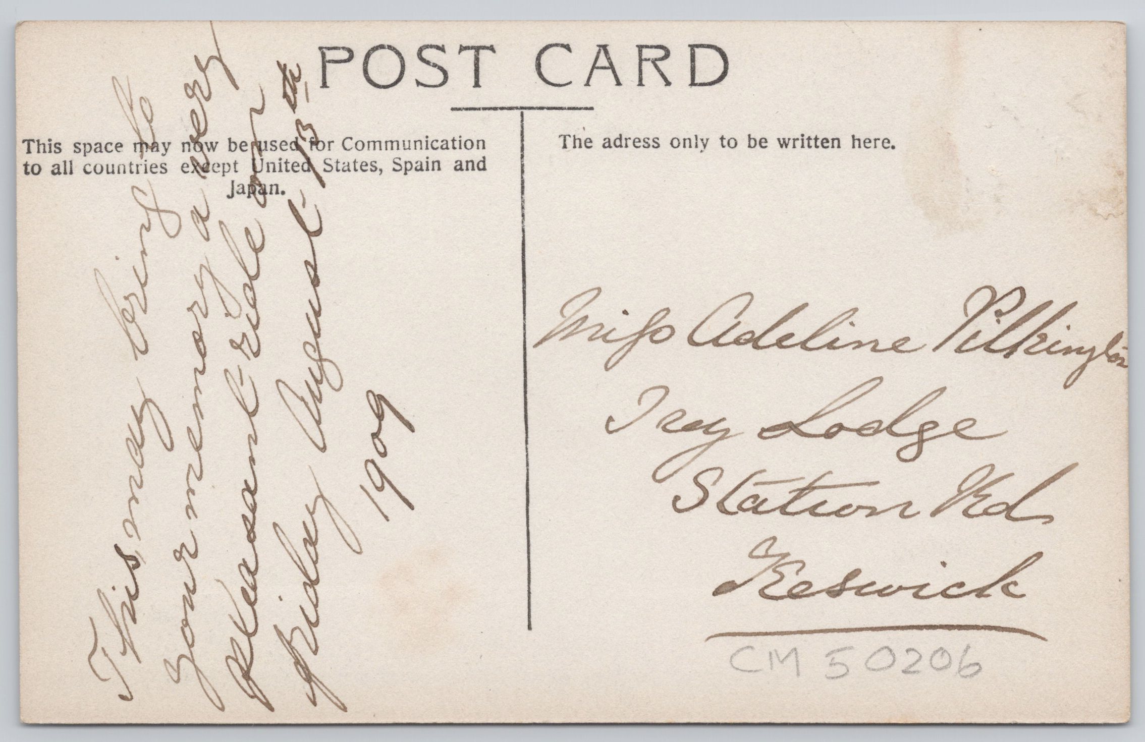 Message on back is dated 1909, unconfirmed. Postcard is in very good order throughout.