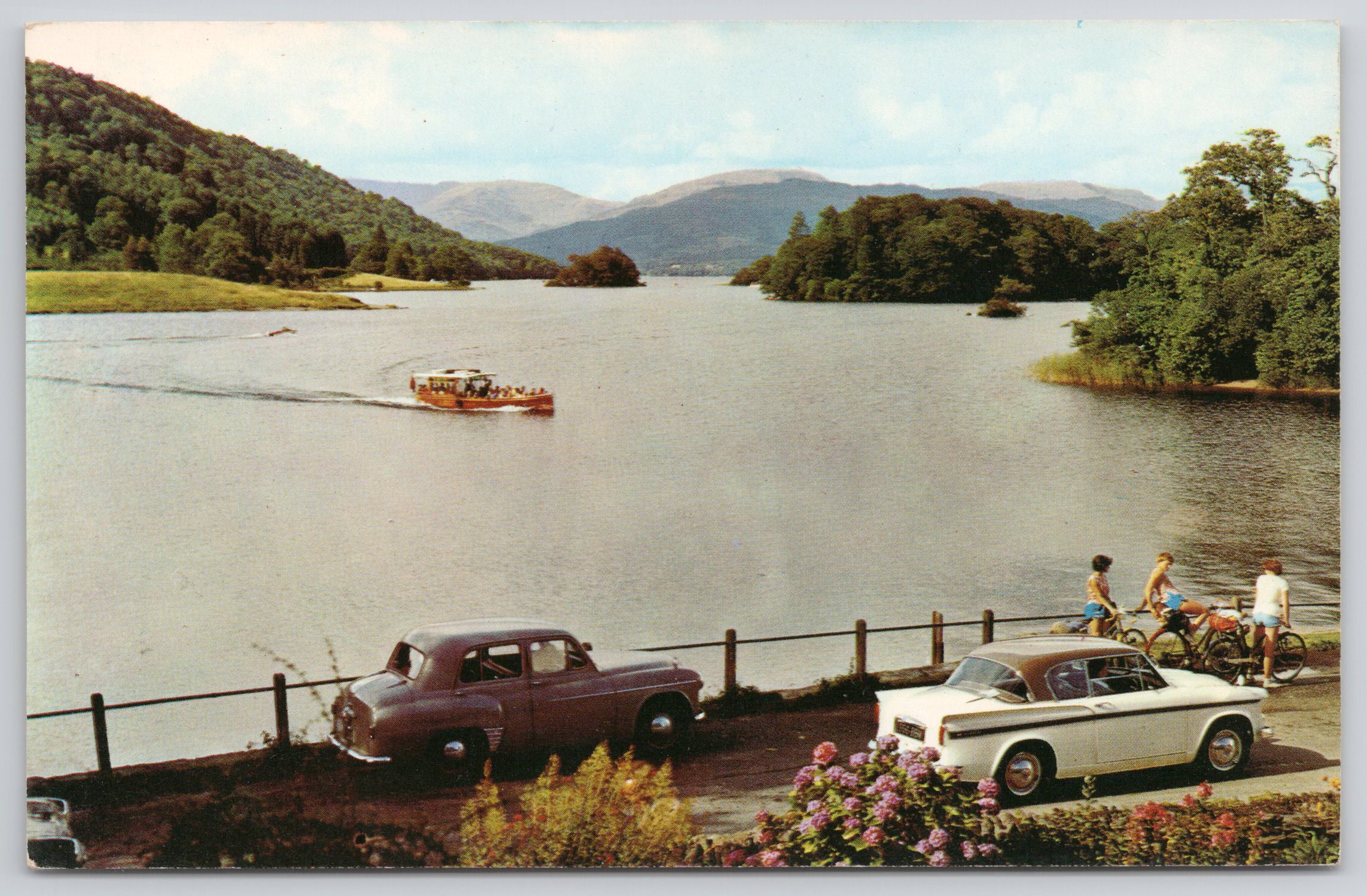 Windermere showing ferry and classic Sunbeam Rapier car.