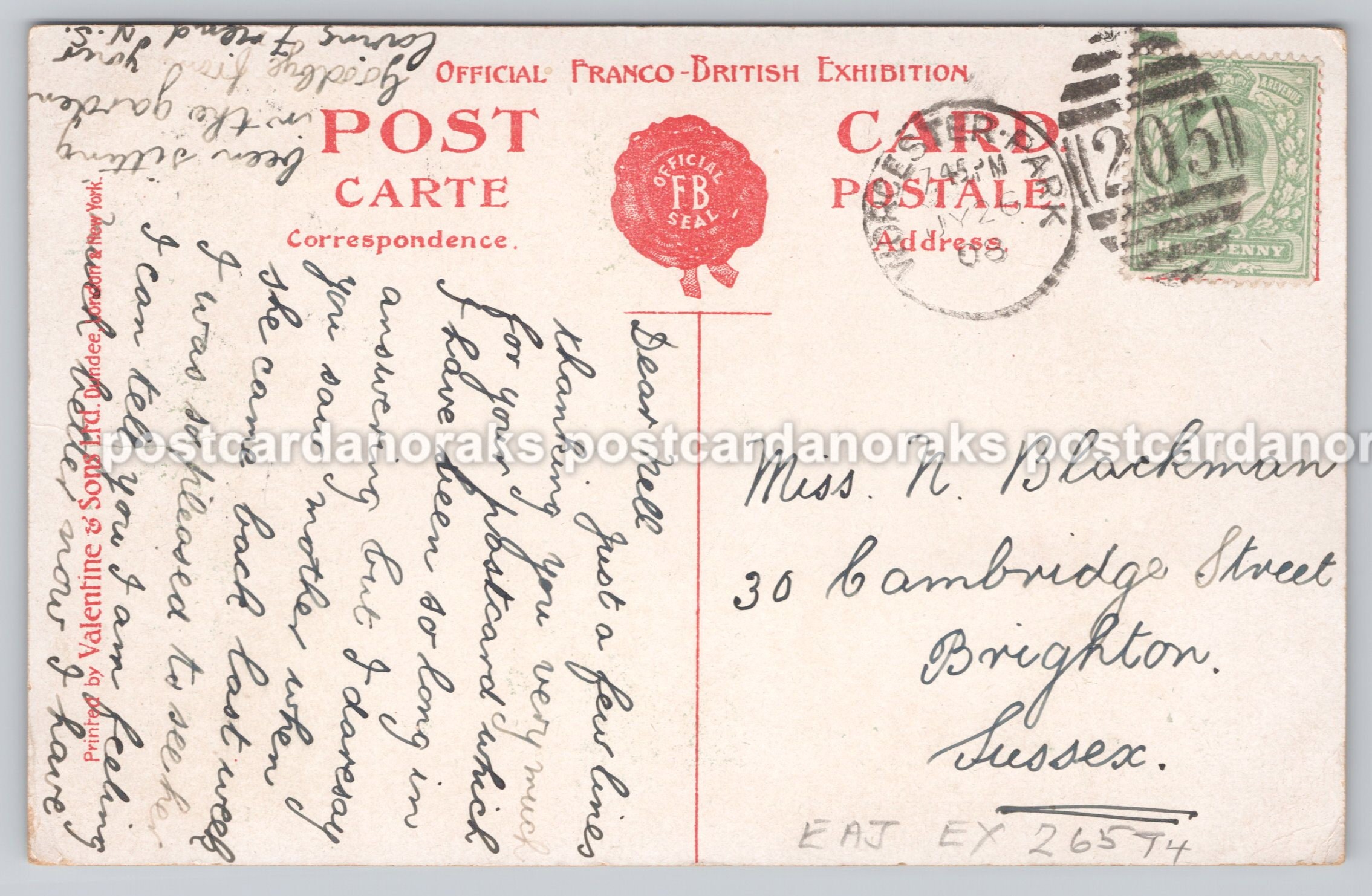 View shows In View Of Arts. Postcard purchased and sent in 1908, during the period of the Exhibition. Reverse has the official FB Red Seal, together with a Duplex 205 ovular franking cancellation. Posted from Worcester Park Surrey to an addressee in Brighton Sussex.