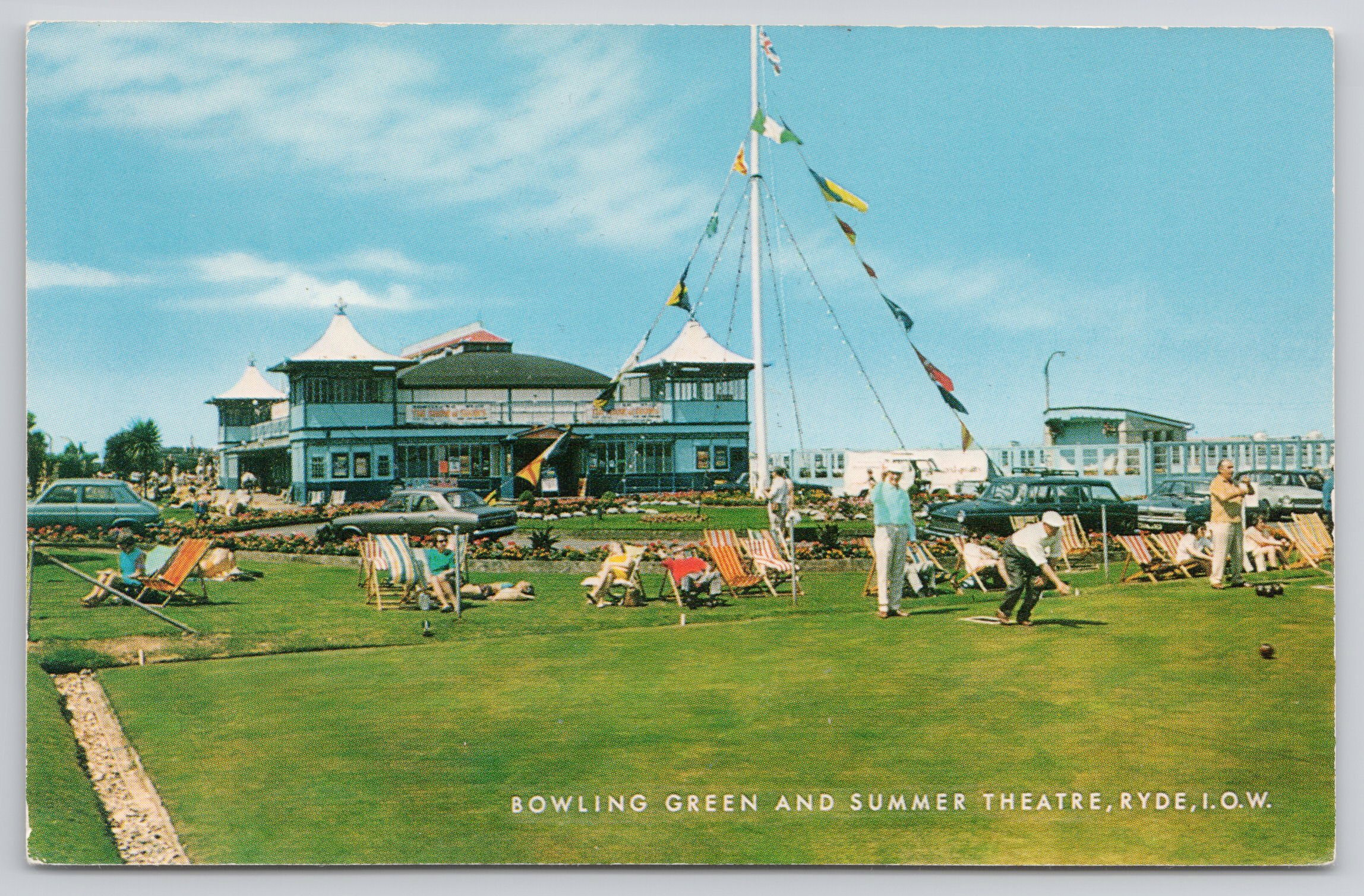 In good order throughout, postcard shows Bowling Green and Summer Theatre. Rare Austin Cambridge Estate in the background.