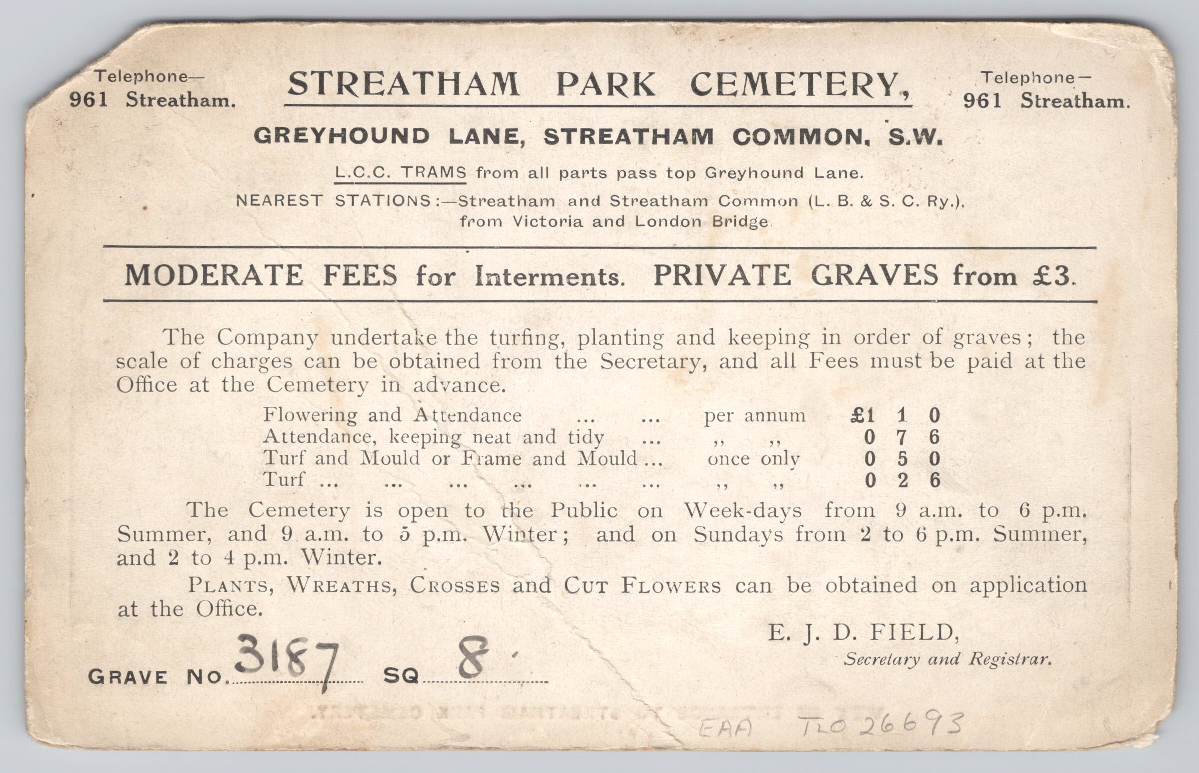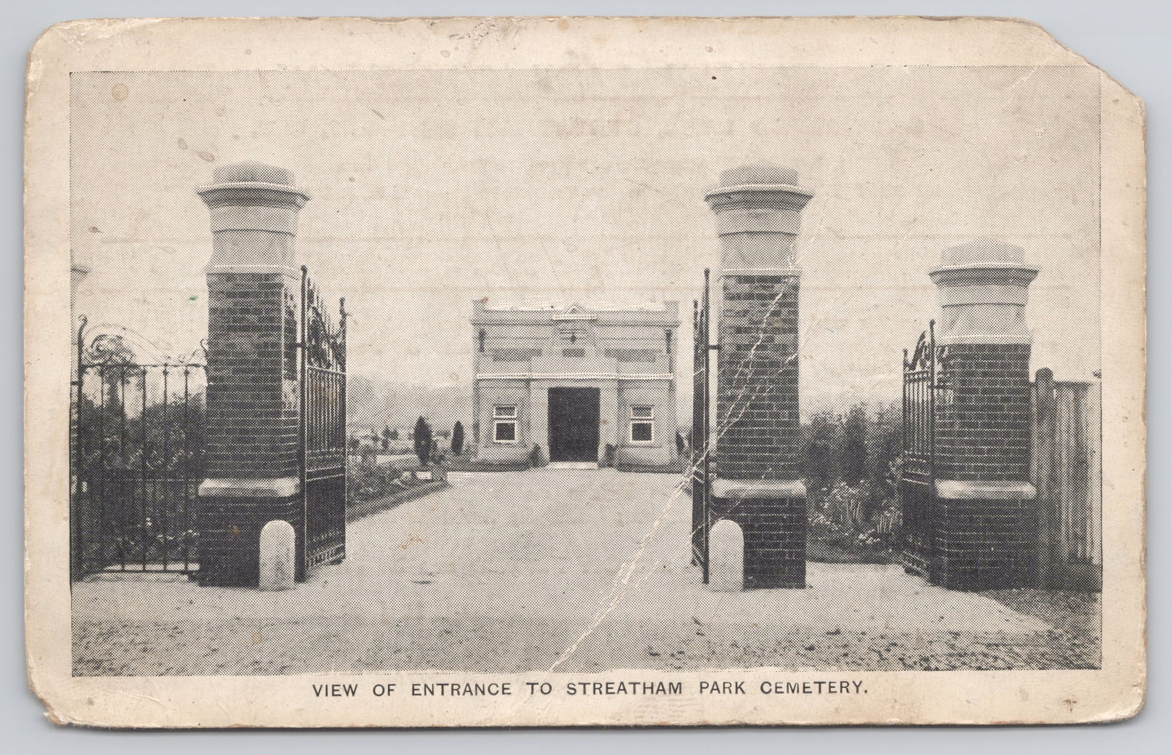 View of Streatham Park Cemetery. Reverse shows actual details of fees and opening times. This particular card has an actual grave no. 3187 and has possibly accompanied the holder to the plot. Has deep fold and corner snip.