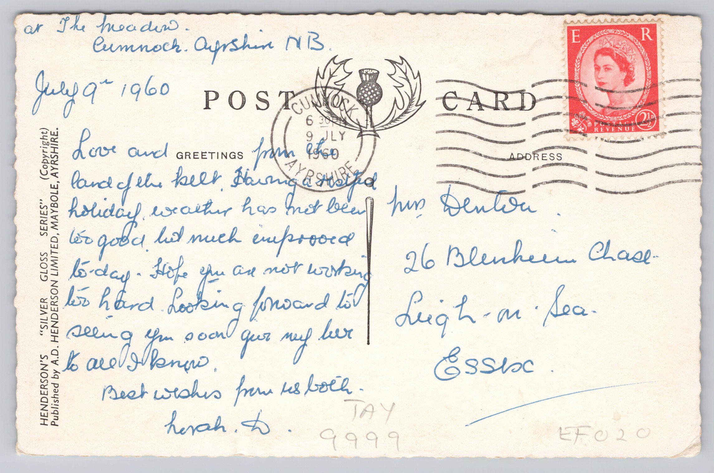 Published locally by Henderson’s Silver Gloss Series, at Maybole Ayrshire. Detailed deckle edged borders, framing the famous bridge. Posted out locally in 1960.