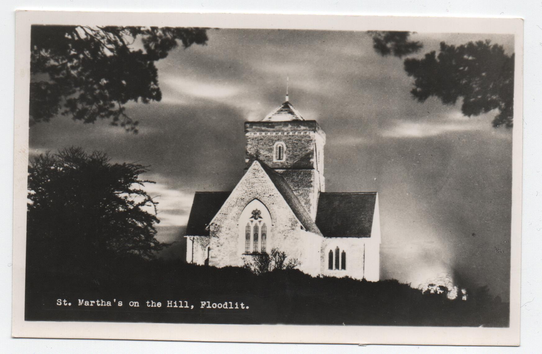 Guildford St. Martin’s On The Hill Floodlit Postcard, this is a real photo postcard in excellent unused condition. Has not been posted.