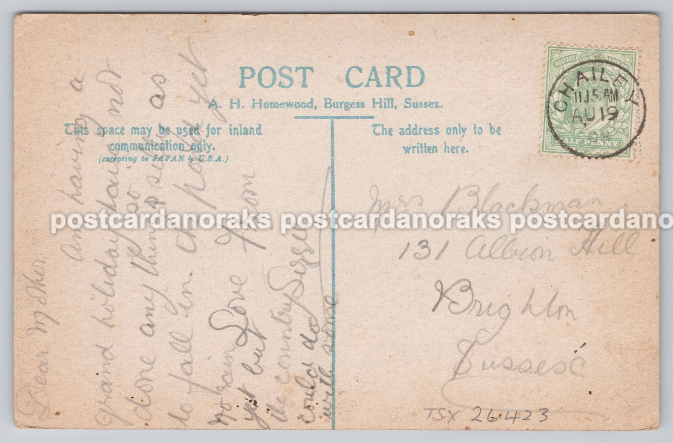 Enchanting view of this beautiful part of Sussex. In very good condition for the year. Posted out locally from Chailey, in 1908, to an addressee in Brighton.