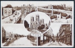 York Lendal Bridge Stonegate Guildhall Postcard. Multiview vintage postcard from leading publisher Valentine’s. In good order throughout, has not been posted.